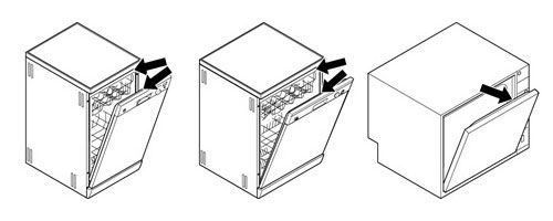 Таблички на посудомоечной машине обычно располагаются на двери с внутренней стороны, предохранительной пластине, на передней панели посудомойки, увидеть можно при опущенной дверке, а также на боковых стенках или задней стенке посудомоечной машины.