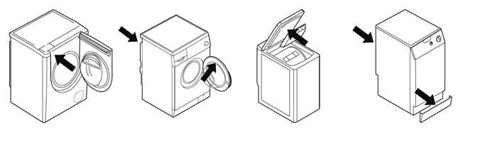 В стиральной машинке все месторасположение технической информации может зависеть от того, горизонтальная или вертикальная у вас стиралка. Передняя панель, там, где находится дозатор, иногда имеет на себе шильдик в горизонтальных моделях. Также для них характерны размещение табличек на внутренней части дверцы люка, как раз над манжетой. Однако, чаще всего наклейку можно найти на задней стенке - в том числе и в вертикальных аппаратах. Они же располагают шильдик на верхней крышке изнутри и на панели снизу, за которой обыкновенно скрывается насос.